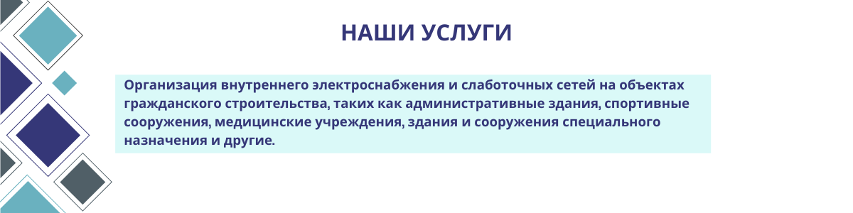 Полный спектр услуг под «ключ»: проектирование, поставка материалов, электромонтажные работы, монтаж слаботочных сетей и техническое обслуживание. Замкнутый цикл услуг позволяет полностью снять риски не эффективного управления Проектом (от стадии разработки задания на проектирование до ввода объекта в эксплуатацию), несогласованности проектных решений с требованиями эксплуатирующих и сервисных компаний.