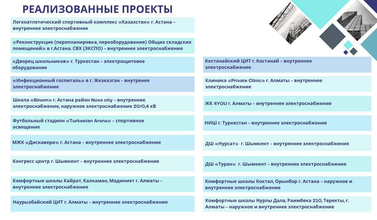 GQ Construction осуществляет строительно-монтажные работы электрических и слаботочных систем в промышленном и гражданском секторах на территории Алматинской, Туркестанской, Кызылординской областях, а так же в городе Шымкент.